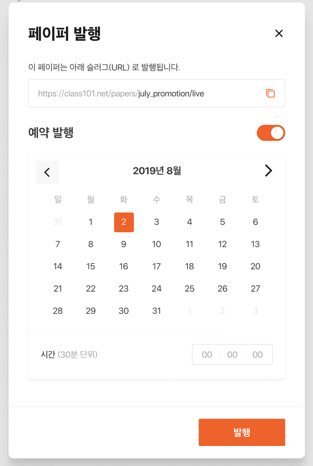 이렇게 수정한 UI의 저장을 하고나면, 페이퍼를 발행할 수 있는 버튼이 활성화됩니다. 발행을 하면 해당 페이퍼의 슬러그(URL)을 제공하고, 언제 배포할지 예약을 걸어둘 수도 있습니다.