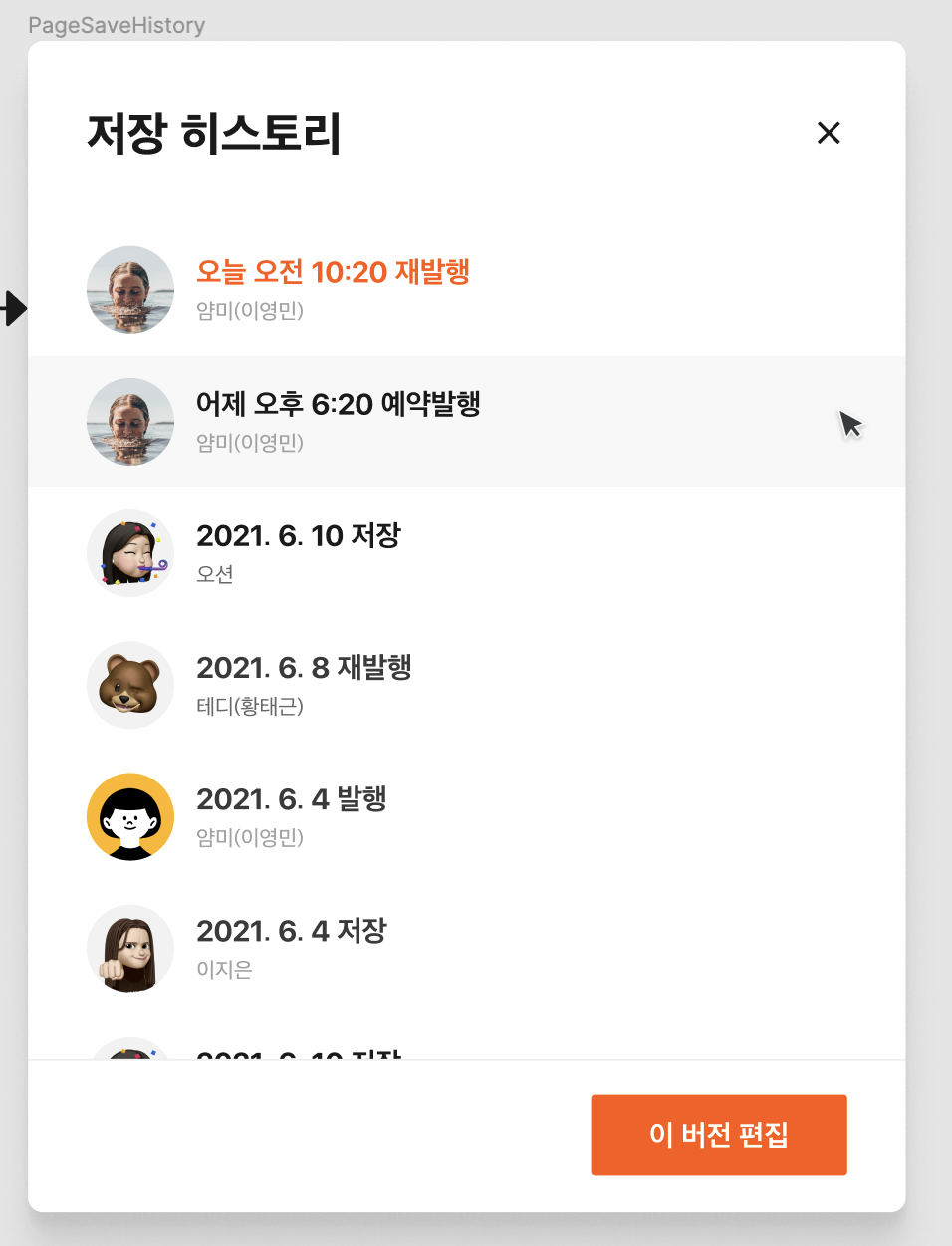 이렇게 수정한 UI는 임시저장도 가능하고, 해당 버전으로 돌아가 편집할 수도 있습니다. 또한 누가 언제 수정했는지 확인할 수 있어 효율적인 커뮤니케이션이 가능합니다.