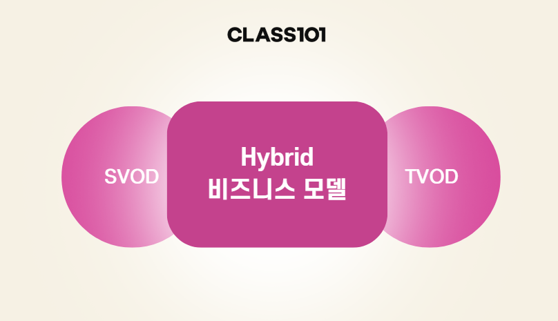 클래스101은 2024년 4월, 연간 구독료를 내고 다양한 강의를 무제한 수강하는 방식인, 구독 서비스(SVOD)와 클래스 개별 구매로 비용을 지불하여 수강하는 방식인, 개별 상품 판매(TVOD)를 함께 제공하는 하이브리드(Hybrid) 비즈니스 모델을 도입했습니다. 이를 현재 클래스101이 보유한 6,000개 이상의 클래스에 적용하여 운영하고 있습니다.