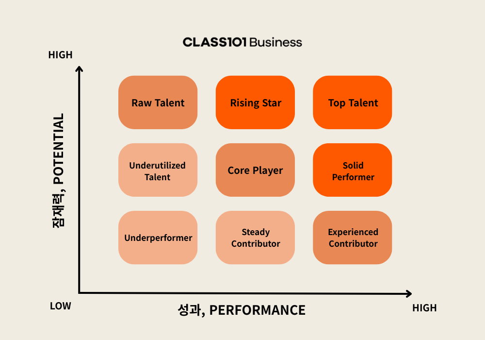 기업에서 핵심인재를 발굴할 때 흔히 사용하는 도구는 9-박스 매트릭스(9 Box Grid)입니다. 성과와 잠재력을 각각 상/중/하로 평가하여 직원들을 9개 칸에 분류함으로써 핵심인재(A급), 차세대 인재, 보통 인재 등을 구분합니다. 성과는 단기 성과뿐 만 아니라 목표 달성, 문제 해결 능력, 혁신성, 협업 역량을 고려하고 잠재력은 학습 능력, 리더십 잠재력, 변화 대응력, 조직 적합도를 고려하여 핵심 인재를 평가합니다.