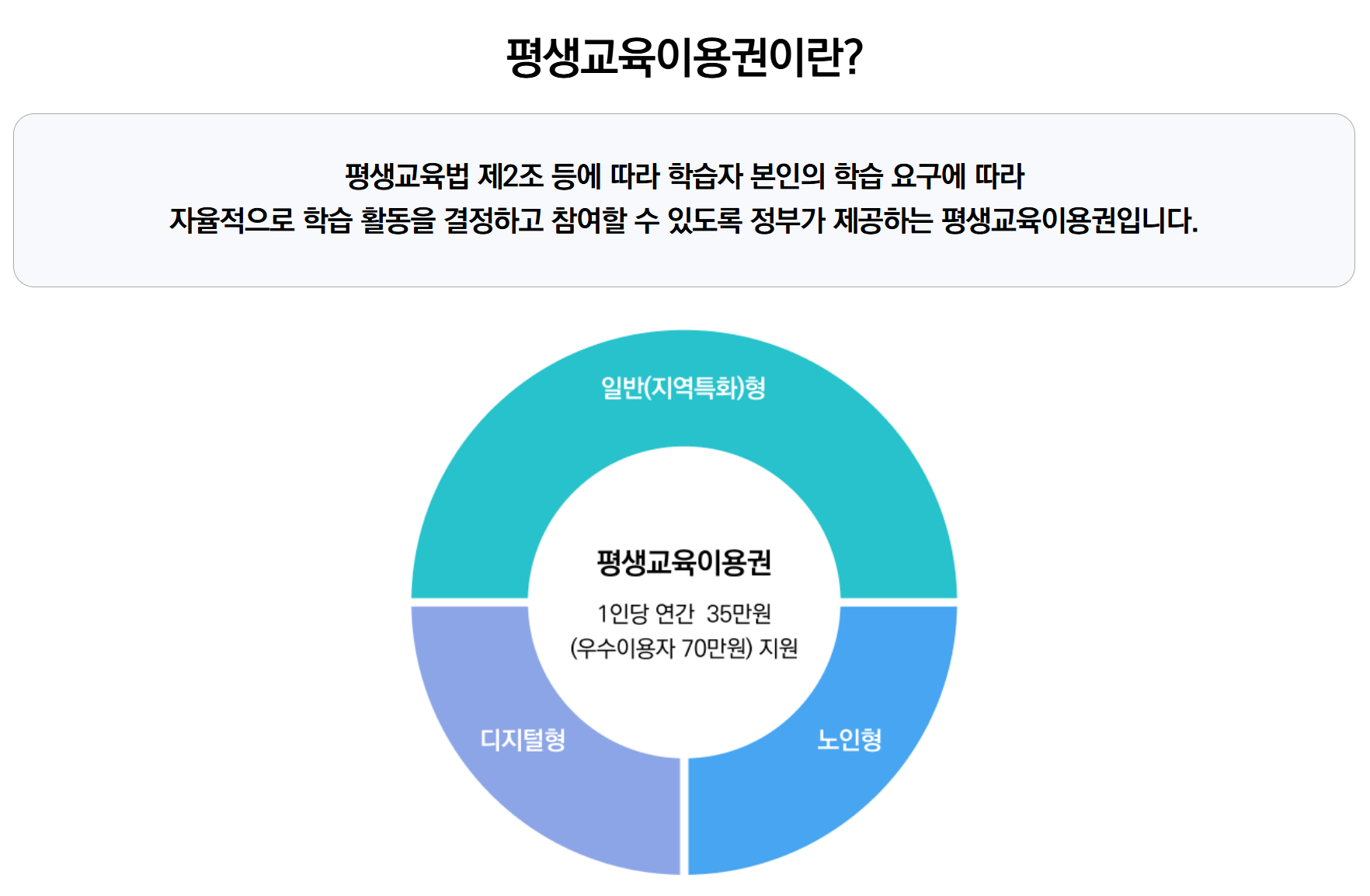 '평생교육이용권'은 국가·지자체가 자율적으로 학습자가 원하는 교육 콘텐츠(오프라인, 온라인)를 선택해 자유롭게 학습할 수 있도록 정부가 지원하는 카드형 학습지원금입니다. (*이전 명칭인 '평생교육바우처'는 2025년부터 '평생교육이용권'으로 개편되었습니다.