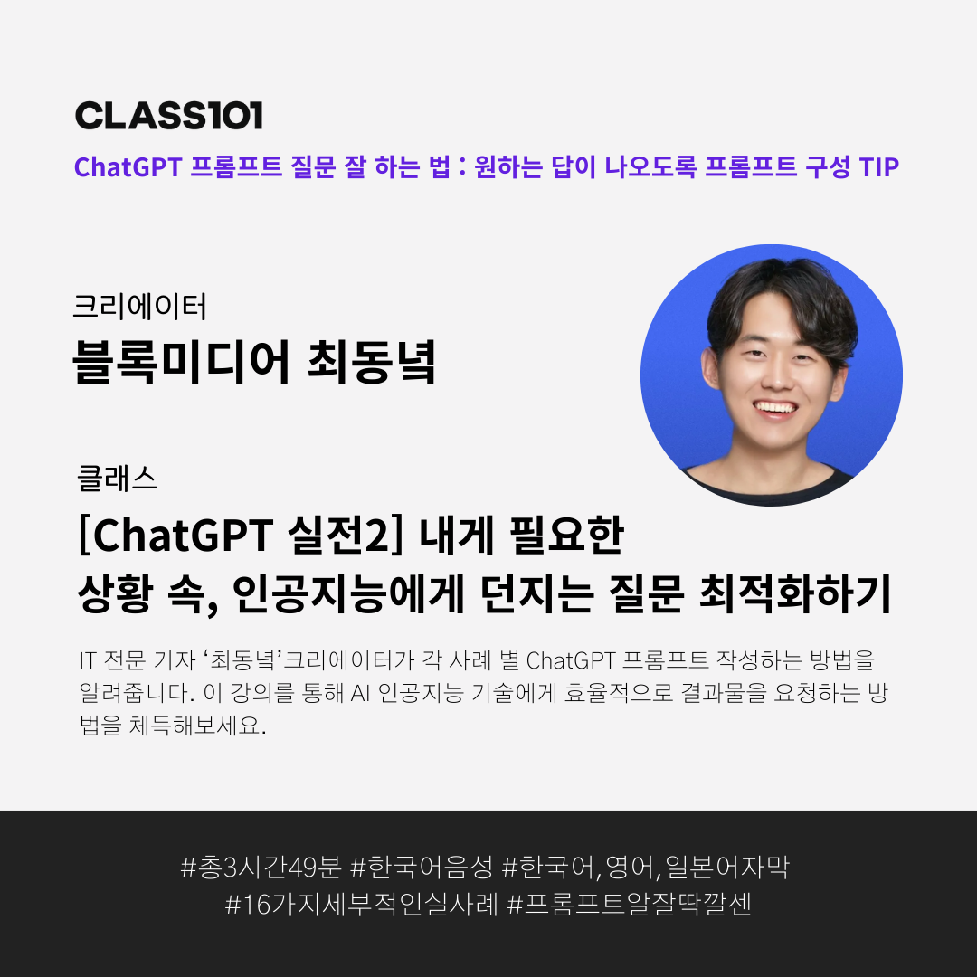⭐ 오늘 클래스101이 생성형 AI, ChatGPT에서 유용하게 써먹을 수 있는 글/이미지 프롬프트 구성 TIP과 다양한 사례로 질문 작성을 연습해볼 수 있는 클래스101의 실습 클래스를 소개해드릴게요.
