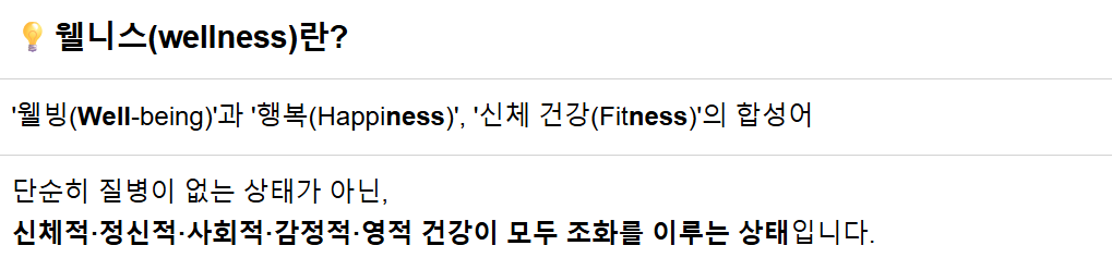 ‘직원 건강 복지’라는 개념은 익숙하지만, ‘웰니스 복지’는 조금 생소할 수 있어요.먼저 ‘웰니스 복지’ 개념을 구성하는 ‘웰니스’의 정의에 대해 살펴볼게요.