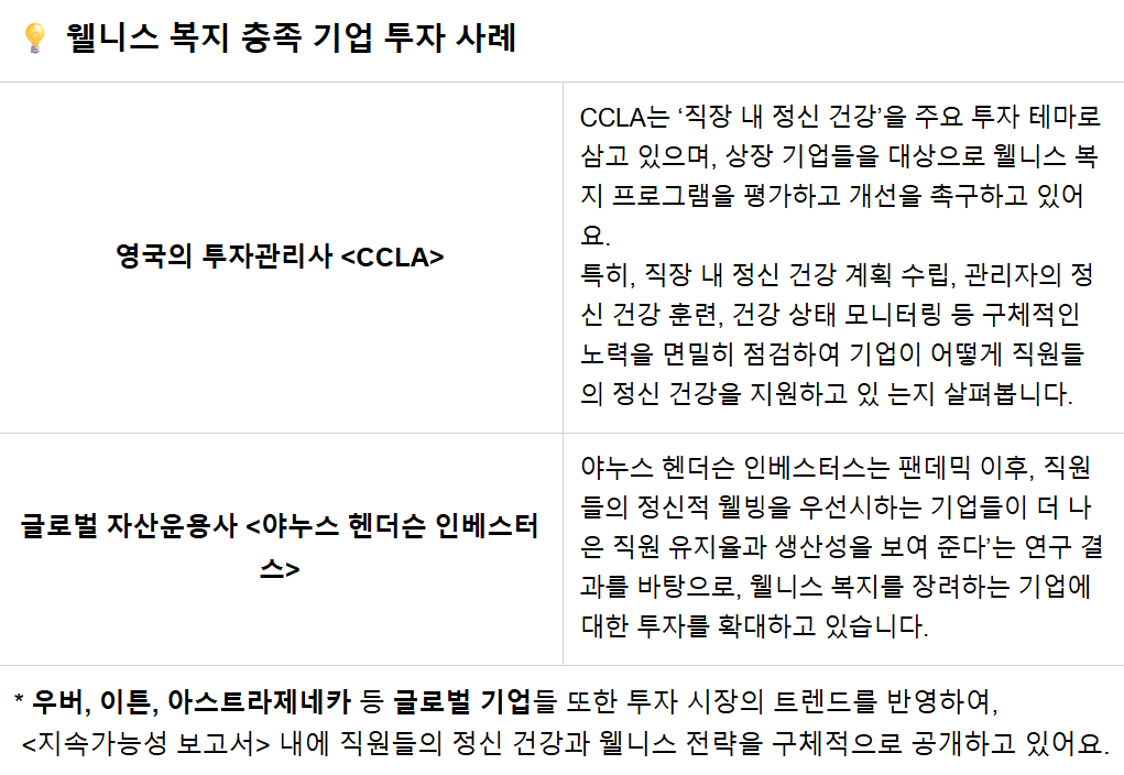 웰니스 복지를 추구하는 건 기업, 직장인만이 아닙니다. 최근 ESG 경영 관점에서 기업 투자를 검토하는 투자자 그룹에게도 기업의 웰니스 복지 지원은 중요한 평가 지표가 되고 있어요.