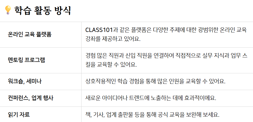직원들이 필요한 지식과 기술을 단계적으로 습득하고, 이를 실제 업무에 적용하여 내 것으로 만드는 실행 과정까지 포함하는 교육 방식이에요. 개인은 역량 개발을 체계적으로 진행할 수 있고, 조직은 개인과 조직의 전략 목표를 일치시켜 장기적인 관점에서 성장에 도움이 된다는 장점이 있죠.
