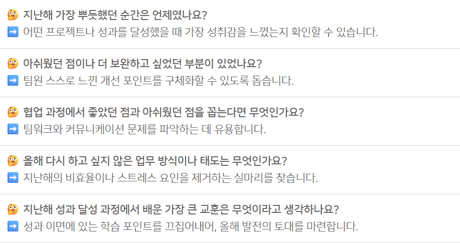 두 번째는 팀과 팀원별 작년 성과를 꼼꼼히 살펴보는 것입니다. 단순한 숫자 외에 과정에서 발휘된 역량이나 협업 기여도 같은 정성적 요소도 빼놓아서는 안 됩니다. 이렇게 지난 성과를 객관적으로 돌아보면, 올해 팀원과 함께 설정할 ‘성장의 방향성’을 구체적으로 잡는 데 큰 도움이 됩니다.