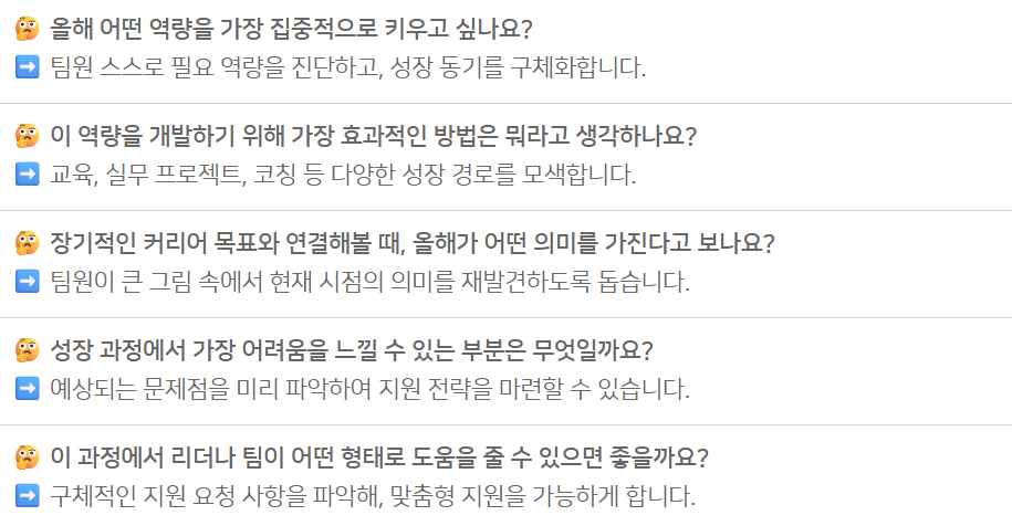 마지막으로는 팀원이 원하는 커리어 방향을 미리 파악하는 것입니다. 올해 조직 목표와 팀원의 역량·관심사를 어떻게 연결할 수 있는지 살펴두면, 구체적인 지원 방안을 제시하기가 훨씬 수월해지죠. 이렇게 개인의 로드맵을 이해해두면, 개인 성장과 조직 목표를 긴밀히 연결하는 원온원 미팅을 만들 수 있습니다.