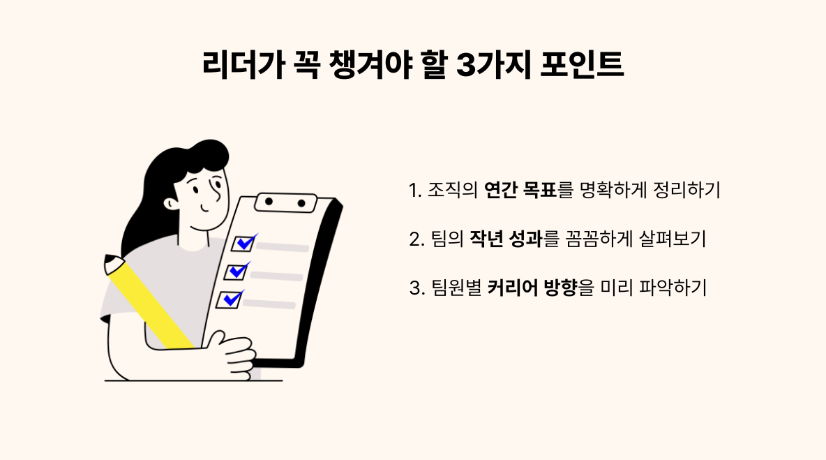 가장 먼저 할 일은 연간 목표를 명확히 정리하는 것입니다. 예를 들어 매출 확장, 프로젝트 안착, 내부 협업 개선 등 올해 우선순위에 따라 팀원의 업무 포인트가 달라지기 때문이죠. 또한 연초에 새로 설정된 조직 전략을 세부 지표(KPI)와 일정 계획으로 나누어두면, 미팅 시 논의해야 할 부분을 한눈에 확인할 수 있습니다.