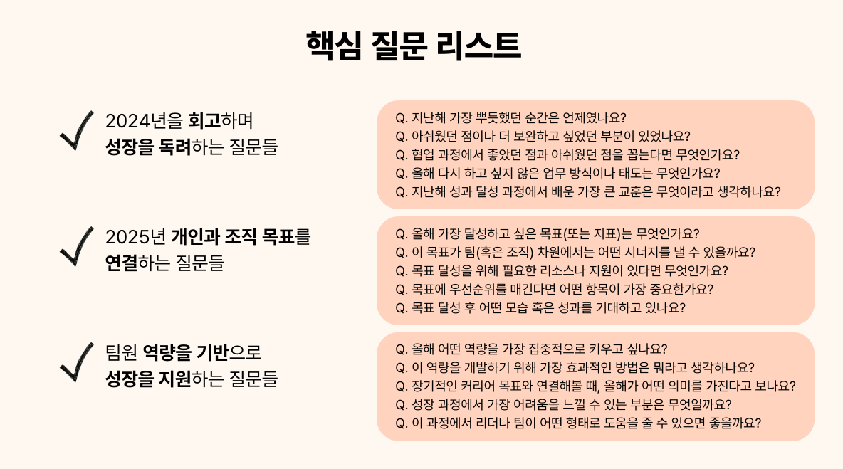 원온원 미팅은 준비되지 않은 상태로 진행하면 그저 ‘알맹이 없는 근황 토크’로 끝날 가능성이 높습니다. 함께 성장할 수 있는 대화의 장으로 만들기 위해서는 꼼꼼한 사전 준비가 필수입니다. 특히 연초라면 작년의 성과와, 올해 조직의 방향을 명확히 파악해 두어야 대화의 핵심을 빠르게 잡아낼 수 있겠죠.