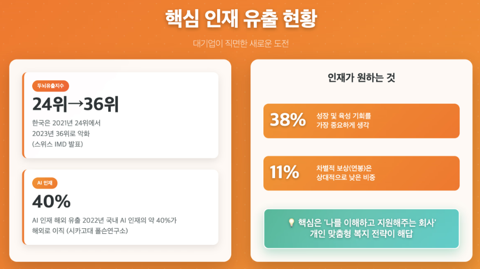 AI, 빅데이터, 반도체, 자동차 등 국내 핵심 산업 분야에서 뛰어난 인재들이 더 나은 근무 환경과 성장 기회를 찾아 경쟁사로 이직하거나 해외 기업에 스카우트되는 사례가 늘어나고 있는 것이죠.