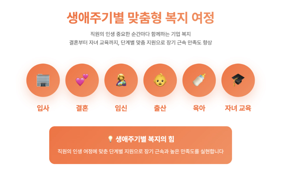 핵심은, 임직원들이 내가 다니는 회사는 나의 삶 전체를 배려하고 있다고 느끼게 하는 것입니다. 이런 긍정적인 경험은 장기간 함께하고 싶은 직장으로 인식하게 만들어, 핵심 인재 유출을 효과적으로 방지할 수 있습니다.