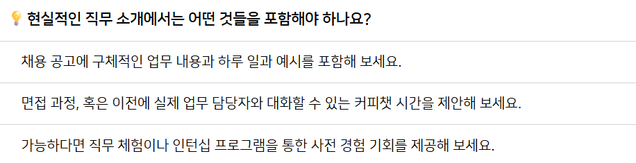 직무 불일치 문제를 해결하려면 채용 단계부터 개선이 필요합니다. 채용 과정에서 정확하고 현실적인 직무 정보를 제공해 보세요.(Realistic Job Preview 라고도 합니다.)
