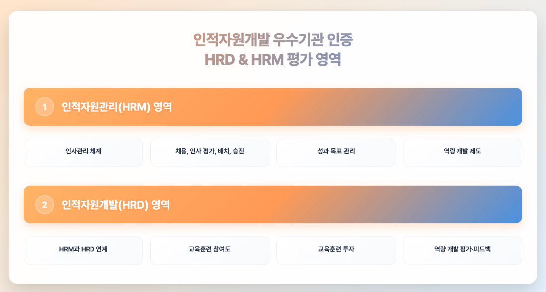 인적자원개발 우수기관 인증은 크게 인적자원관리(HRM)와 인적자원개발(HRD) 두 영역을 중점적으로 평가합니다. 단순히 제도가 준비되어 있는지 보는 것이 아니라 실제로 잘 운영되고 있는지, 성과는 어떤지 구체적으로 살펴보기 때문에 체계적인 준비가 필요해요.