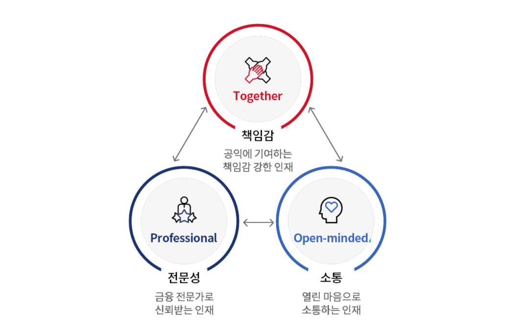 Together는 개인의 이익보다 공익을 우선시하며 맡은 업무에 책임감을 갖은 인재를, Open-minded는 동료와 국민을 향해 열린 마음으로 소통하고 협력하는 인재를, Professional은 끊임없는 자기 계발을 통해 금융 전문가로서 국민의 신뢰를 받는 인재를 의미해요. 예금보험공사에서는 이 인재상을 바탕으로 직급별, 경력 단계별 맞춤형 역량 개발 체계를 구축하고 자기 주도적 학습 문화를 지원하고 있습니다.