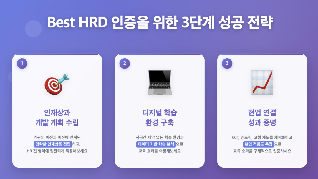 교육과 업무의 연계성을 높이는 OJT, 멘토링, 코칭 제도를 체계화하고, 현업 적용도를 측정하는 평가 시스템을 구축해 보세요. 예금보험공사의 '적시 집중 연수'처럼 실제 업무를 교육과 연결하면 교육 참여도와 효과가 모두 높아진답니다. 이렇게 교육 효과를 구체적인 수치로 입증할 수 있어야 Best HRD 인증에서 좋은 평가를 받을 수 있어요.