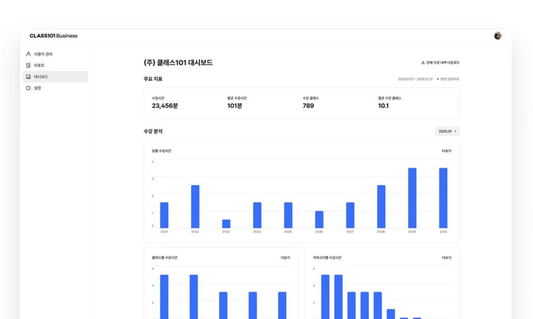 기관에서는 클래스101의 교육 관리 시스템(LMS)을 통해 직원들의 학습 현황과 진도를 체계적으로 분석할 수 있어요. 학습 데이터는 교육 효과를 정량적으로 측정하고 인증 심사에서 요구하는 성과 지표로 활용할 수 있기 때문에, 인적자원개발 우수기관 인증 획득에 도움이 될 수 있답니다.