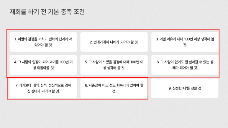 : 상대의 ‘말’과 행동에 담긴 심리적 진심을 읽는 훈련을 통해, 다시 관계를 시작할 때 필요한 ‘심리적 주도권’을 되찾습니다.