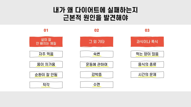 - 다이어트 실패의 원인을 이해하고 폭식 루틴을 끊는 법을 익힙니다.