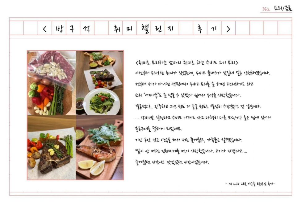 평소에 배워보고 싶었지만 시도해 보지 못했던 취미를 쉽게 접근할 수 있었고, 무료했던 일상에서 벗어나 새로운 것들에 집중하는 주말과 여가시간을 보낼 수 있다고 해주셨어요. 기획자로서 뿌듯했죠. 참여한 직원분들이 후기를 정성스럽게 남겨주셔서, 1회 차가 끝나고 그림일기 형식으로 후기 콘텐츠를 만들어서 공유하기도 했습니다.