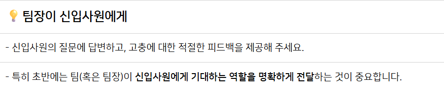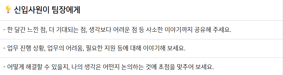 단, 3개월 차까지는 ‘업무 숙련도’보다는 ‘소속감’이 우선이라는 점을 잊지 마세요! 무리하게 성과나 역할을 요구하기보다는 이야기를 들어주시는 태도가 필요합니다. 팀 빌딩 활동이나 사내 동호회 활동이 있으면 함께 알려주시고, 회의 중에도 신입사원의 아이디어나 의견을 적극적으로 수렴하고자 한다는 태도를 보여주세요.