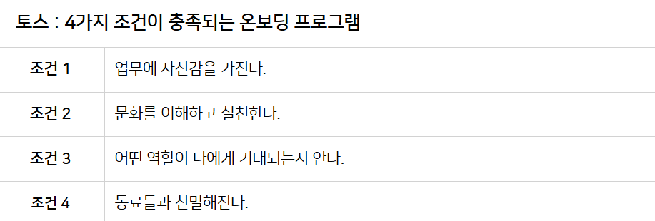 국내 IT 스타트업의 대명사 토스는 총 3개월 동안 아래 4가지 조건을 충족할 수 있는 온보딩 프로그램을 진행한다고 합니다.
