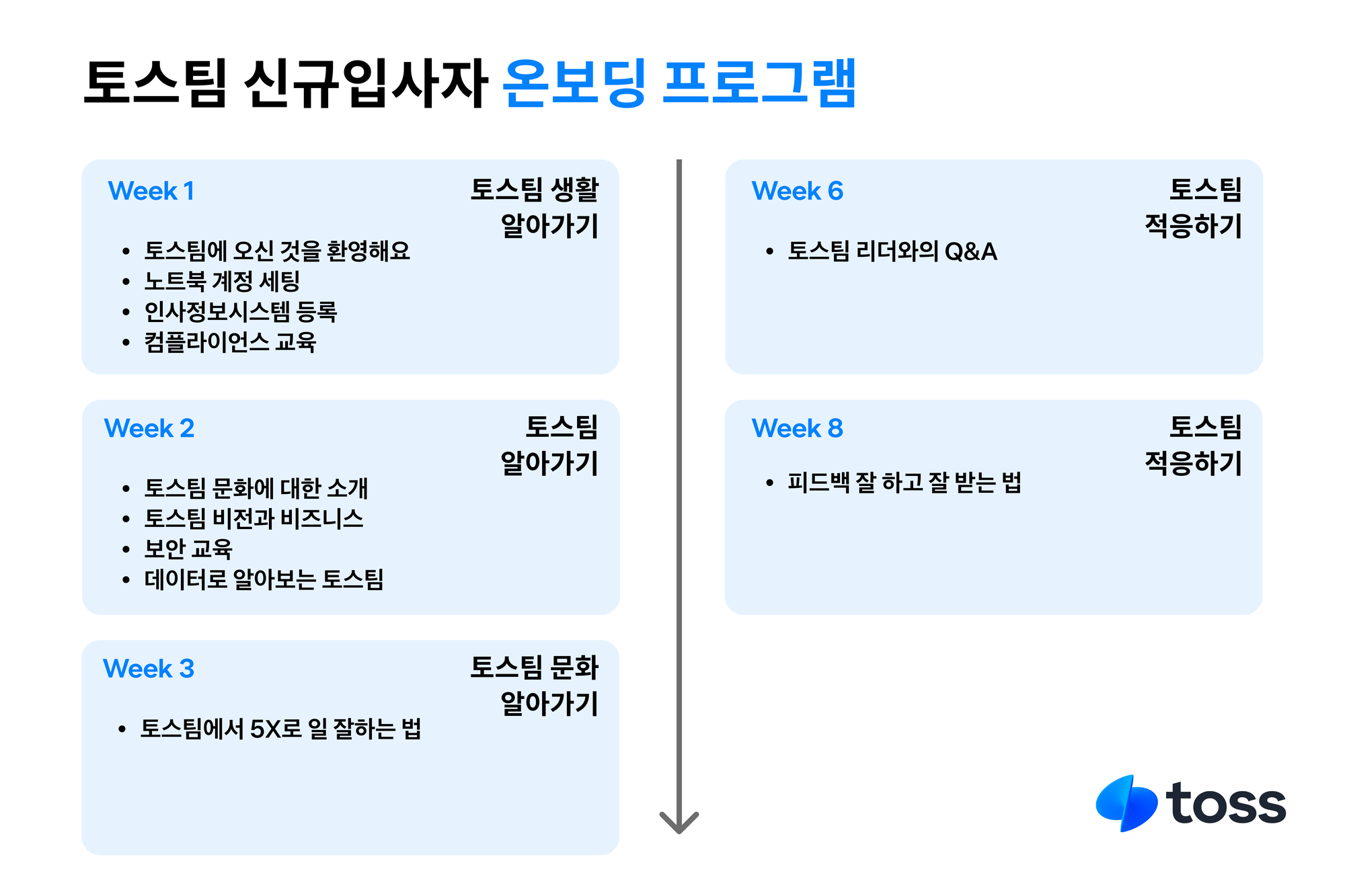 입사 첫날, 보다 가뿐한 마음으로 환영받는 하루를 보낼 수 있도록 노트북을 제공하지 않는 것부터 시작해서 구체적으로 토스 팀 생활 알아가기, 토스 팀 문화 소개, 비전과 비즈니스, 5X로 일 잘하는 법, 리더와의 QnA, 피드백 잘 하고 잘 받는 법 등 신입사원이 알아야 하는 정보와 토스의 문화를 세 달에 걸쳐 공유합니다.