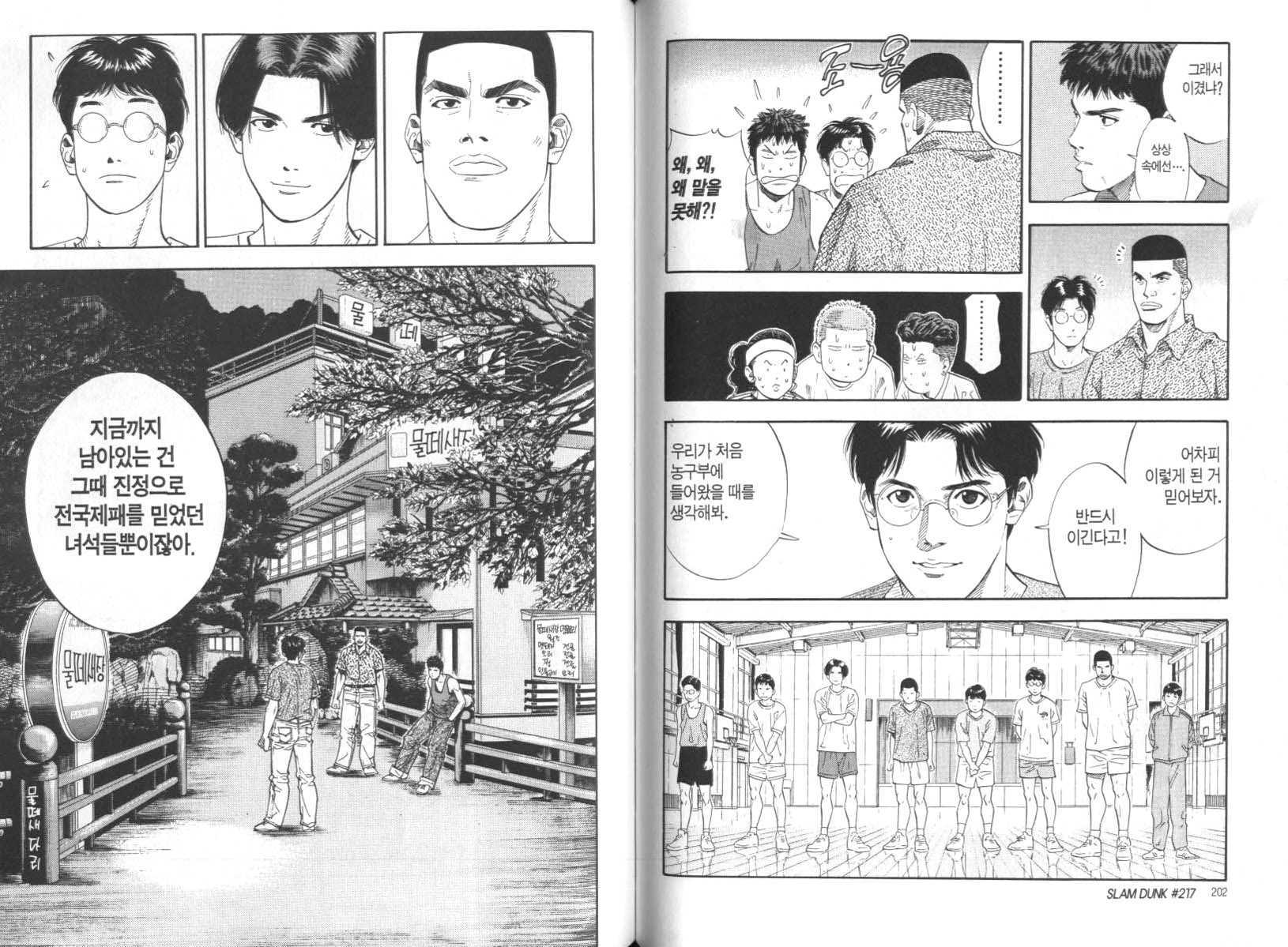 슬램덩크, 북산고 농구부가 3년 만에 전국대회 첫 출전을 앞두고 채치수, 권준호, 정대만이 나눈 대화 중