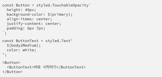 다만 여기서 앱 개발자는 동일한 방식으로 코드를 작성할 수 없었습니다. 앱은 당시 네이티브 디자인 시스템 라이브러리가 존재하지 않아, 앱 개발자는 ‘바로 시작하기’ 버튼을 개발하기 위해서 하나씩 스타일을 분해해가면서 코드를 짜야 했습니다. 저 위치에 Primary 버튼이 존재하니까 이 버튼의 패딩은 8이고, 높이는 40 px이고, 텍스트 폰트 사이즈는 14이고… 이런 식으로 하나씩 손수 개발해나가면서 네이티브 앱을 개발하고 있었습니다.
